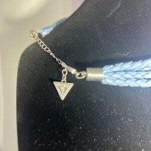 GUESS Silver-Tone Multi-Layer Blue Faux Leather Statement Necklace GUESS goes urban and sophisticated with this edgy multi-layer statement necklace, which features blue faux leather and silver-tone mixed metal details.