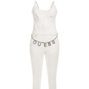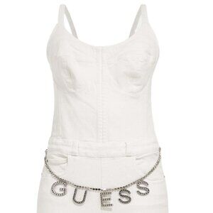 GUESS Skinny Denim Jumpsuit Logo Stones Belt Zip Back Bustier One Piece WHT S/P