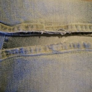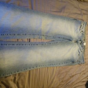 Light colored denim Guess Solana Jeans. These sit lower on the hip and are fitted to the knee with a wide flare. Very flattering, but do run small I am normally a 30-31 and these fit snug for a 32. Good length, I am 5'11 and these are good length. Slight damage to bottom hems on the back, and a very tiny blue mark on thigh. Otherwise very minimal wear and in great condition.