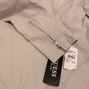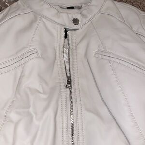 A trendy faux leather jacket with front zip pockets and snap button at the neckline.