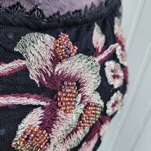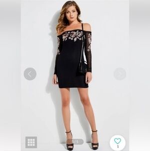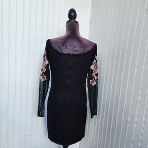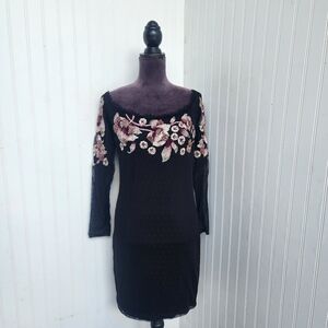 GUESS Stretch Floral Embroidered Mesh Bodycon Mini Dress Black Long Sleeve Sz L