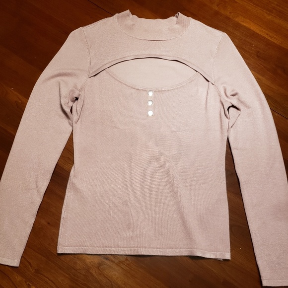Blush pink fitted GUESS sweater worn great with jeans for a casual look or black leather skirt for a night on the town.