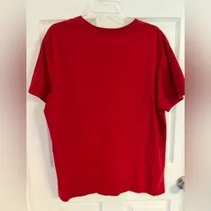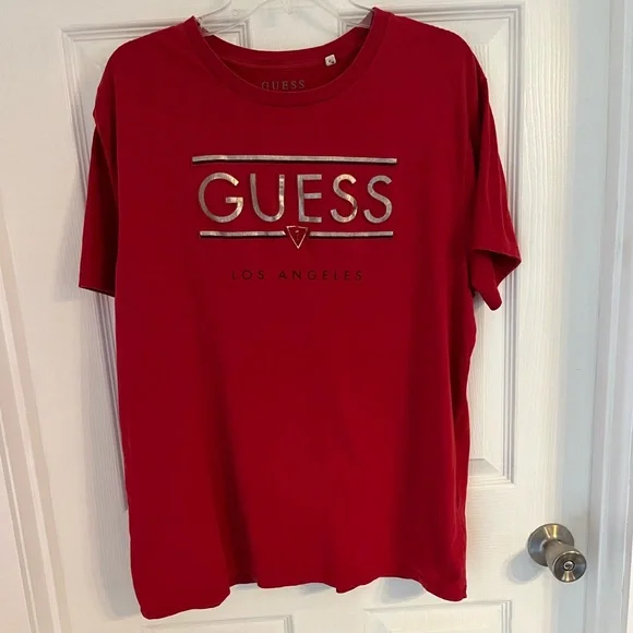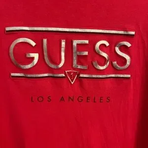 GUESS red tee, with gold 3D lettering on front. 23 pit to pit 26 length from nape of neck PP255105.NUZ.5.5