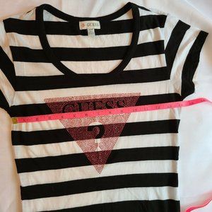 GUESS Triangle Logo XS Beaded black white stripe Scoop Neck Top Tee Shirt