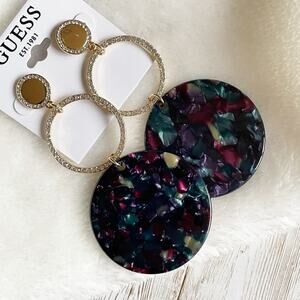 GUESS women’s triple round oversized dangle drop pierced earrings in gold tone accented by clear rhinestone pave with multi color dark purple and black acrylic discs at bottom.