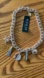 Stylish necklace with silver and gold tones. Features multiple charms including a flower and tassel. Perfect for any occasion.