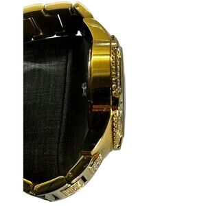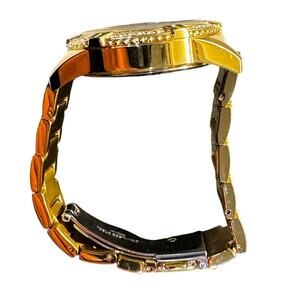 Case: round gold-tone stainless steel with crystal accents; 40mm