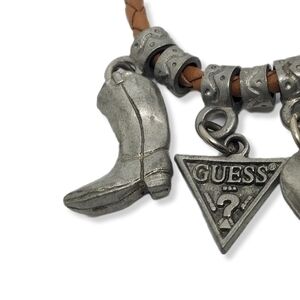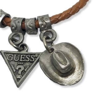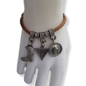 Very cute vintage cowgirl themed charm bracelet by Guess. Bracelet features a brown braided faux leather cord with silvertone cowgirl themed charms made of pewter. Charms are a cowgirl hat, boot and Guess logo charm. Bracelet measures 7 inches in length and is in great condition