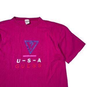 GUESS VTG 90s USA Logo Spellout Crewneck Tee T-Shirt Pink Purple