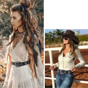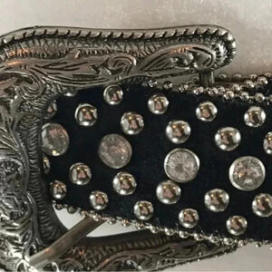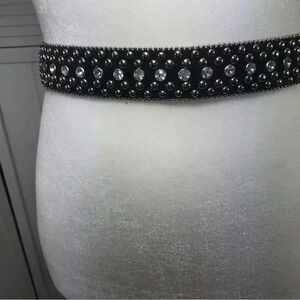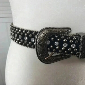Vegan/synthetic material western belt in shimmering black with tiny stars (see last picture where 2 stars are inconspicuously missing) In WONDERFUL pre-owned condition! Size: Medium No missing stones or studs.