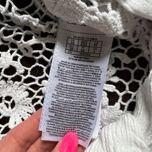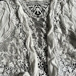 White lightweight cardigan/shrug from Guess in a size XS. This white cardigan features a lace/mesh open back and has long waterfall sleeves. The shrug is open on the front and can be tied. This cardigan is in excellent preloved condition with no flaws.