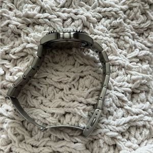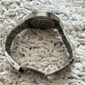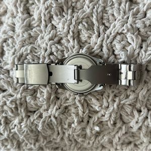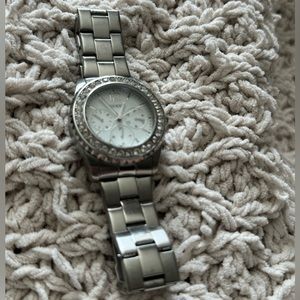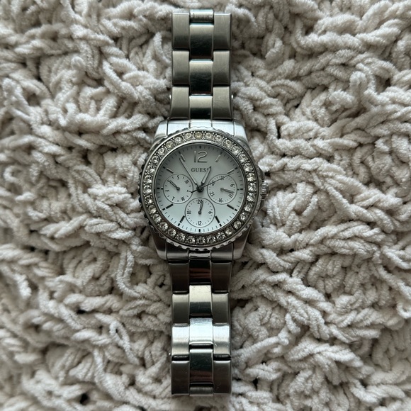 Silver GUESS watch. All rhinestones are intact. Battery needs to be replaced. A few scuffs on the links and side as pictured. First snug but comfortable. Links are able to be removed with smaller wrists. Circumference of my wrist is 16cm and watch fits perfect without moving around.