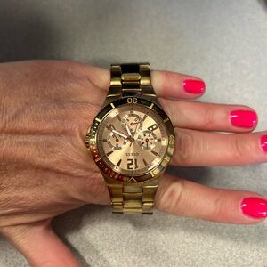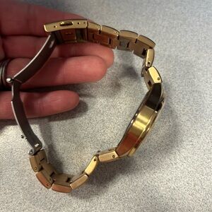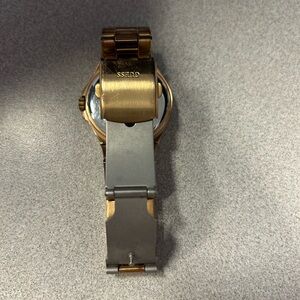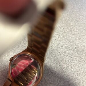 Some wear, rose gold. Does need a battery. Heavy in weight. Extra links included.