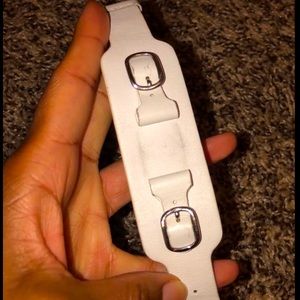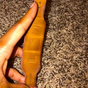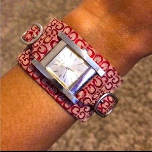 Preowned GUESS watch with three changeable bands (red signature canvas band, white leather band and black patent leather band). See photos for overall condition and any minor defects on bands. Watch/clock itself does require a new battery.