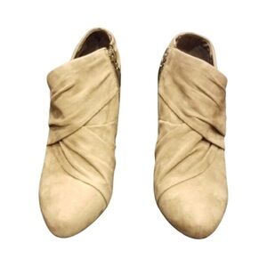 New without box Guess suede booties with 5” heel in tan from pet-free/smoke-free home. Hidden platform.