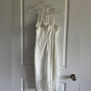 Step out in style with this elegant white lace dress. Perfect for any occasion, this dress offers a sophisticated look with its intricate lace detailing. A must-have addition to your wardrobe.