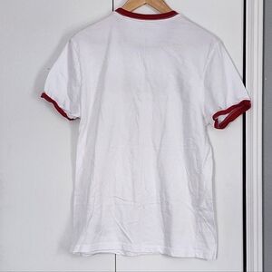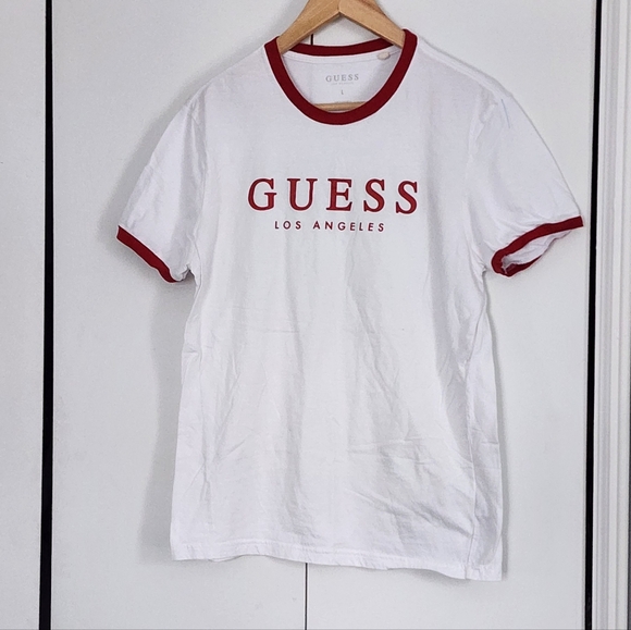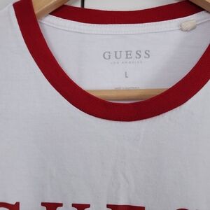 Stylish GUESS tee with red trim. Comfortable and versatile. Perfect for casual wear.