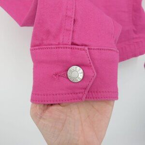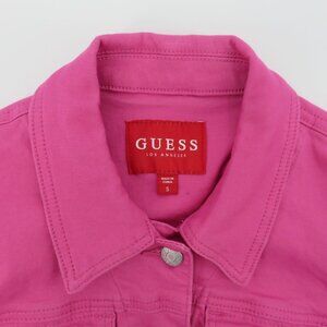 GUESS Women Small Pink Stretchy Denim Jean Jacket Collared Button Front Pockets