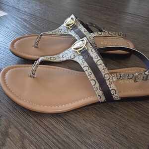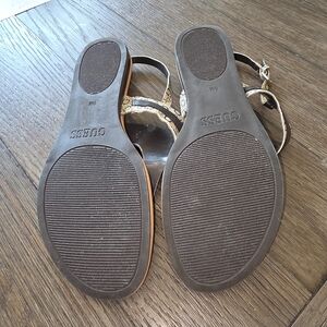 Step out in style with these GUESS sandals. Featuring a black and tan design, these sandals are perfect for any occasion. Quattro G Logo