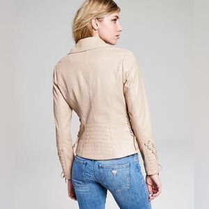 GUESS Women’s Faux-Leather Moto Jacket | Latte Beige Asymmetric Zip Coat XXL Turn heads with this GUESS Women’s Faux-Leather Asymmetric Moto Jacket, designed in a gorgeous latte beige color with edgy lace-up sleeve accents. The buttery-soft faux leather and fitted cut give it a luxe, elevated look — perfect for dressing up or down.
