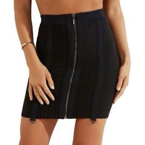 This bold and sultry mini skirt from GUESS features a sleek bodycon silhouette with an exposed front zipper, tonal logo pattern, and chic garter-style accents at the hem. The perfect statement piece to pair with a fitted top or leather jacket for a night out.