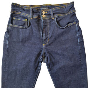 GUESS Women's Shape Up Skinny High Jeans in a size 30 and 29" inseam are designed to provide a low-impact fit with a high-rise waist and slim fit. Made from denim fabric with added shaping features, these jeans are zip-closed and accented with the GUESS logo. The dark wash and solid blue color make them versatile for all seasons. Perfect for women looking for a stylish and comfortable option for everyday wear.