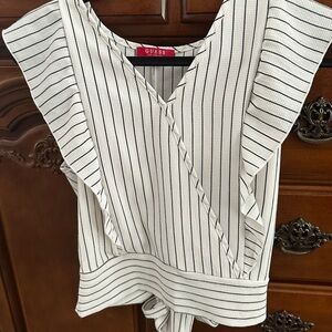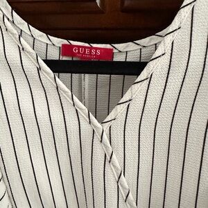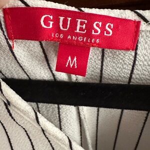 Elevate your style with the GUESS Women's Striped Wrap Top. Featuring a chic black and white stripe design, this top is perfect for any occasion. The wrap style adds a flattering touch to your silhouette.