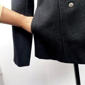 Super flattering wool blend pea coat featuring a snap button closure that can be worn several different ways. Hidden on seam pockets at the perfect spot to stow your chilly hands. Very warm but not bulky. In black color that will be your new black.