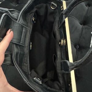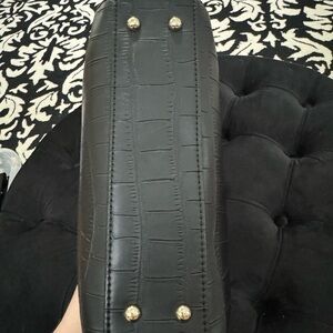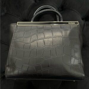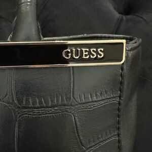 GUESS Y2K Black & Gold Croc-Embossed pattern Vegan (faux) leather Small Purse Hand Bag VTG Classy Preppy EUC. Has the rings inside for a crossbody strap to be used but does not come with the strap. Magnetic closure, bottom feet, two interior pockets & one interior zip pocket. Chic black satchel with croc-embossed texture. Such a nice Y2K purse.