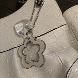This authentic GUESS Y2K buckle satchel (#9637) features a cream faux‐croc exterior, silver studded hardware, front buckle snap closure, and signature charm. A standout example of early 2000s designer-style handbags. Pre-owned and in very good condition—with light normal wear.