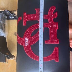 Thus us a authentic Guess bag with emblem beautifully beaded in n red 10 inches going across w guess camera strap very trendy great buy 😍