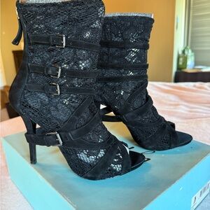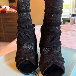 Elegant black lace & suede booties, 4 1/4”heels with a stylish design.