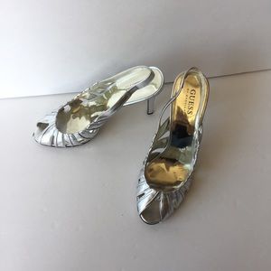 GUESS by Marciano silver sling back peep toe heels. Size 7. Gently used. Great for weddings, prom, dances, balls,
