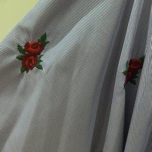 I bought this fun, flowy summer GUESS dress in Rome on Via del Corso. Only worn one time and in excellent condition. This dress is a size Medium, 100% cotton and has thin, light blue and white stripes with embroidered red roses. The whole dress is lined with white cotton fabric. The straps are adjustable and can be removed from the hooks for a strapless look, too.