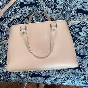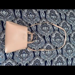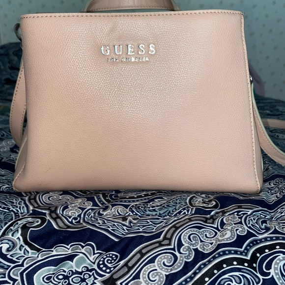 Light baby pinkish color GUESS handbag with magnetic button closure & one inside zip pocket. Has two handles for easy carrying or a long strap for cross body or hang off the shoulder bag. Good condition.