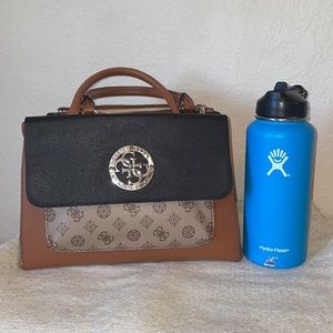 GUESS handbag only used twice. So much room in here! Front magnetic enclosure, back zipper closure. FOUR large main pockets. 1 small side zipper inside and 1 main large zipper inside. Small scuff on back. Hydro Flask used for size comparison.