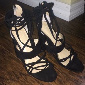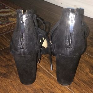 4 in heel black suede GUESS heels Strappy detail with tie up legs and silver metal on end of ties and silver zipper. Worn once