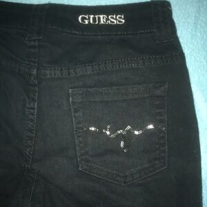 2 back pockets, 2 front pockets with small coin pocket, button and zipper closure. Silver Guess word on back waistband. Black sequins design embroidered on back pockets.