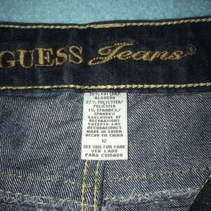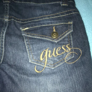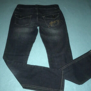 Guess jeans dark blue light washed vintage skinny stretchy 2 back pockets that snap closed, 2 front pockets with small coin pocket, button and zipper closure. Guess is embroidered on back pocket.