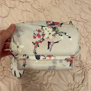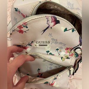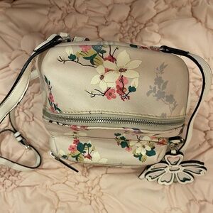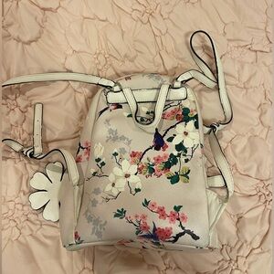 Good condition- used but still in tact, no great damages. All designs are still visible and clear. Multiple pockets on inside with a pouch on the outside. Removable straps and charm.