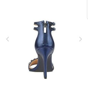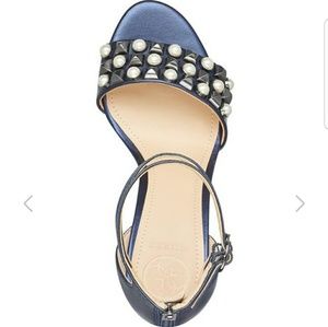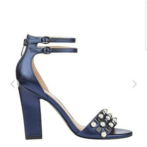Stud and pearl details trim these faux-suede sandals, designed with two ankle straps and a back zipper closure.