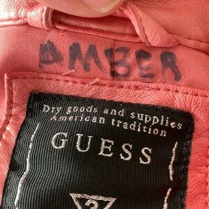 Guess pink crop faux leather jacket XS, pit to pit 16", length 19", has "Amber" in sharpie by tag. see all pictures, good condition, smoke and pet free home