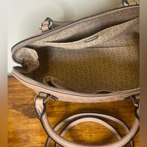 This Dusty Mauve handbag shown features an embossed "G" pattern on the outside with a beige G monogram pattern interior. This purse handbag satchel, with the SKU number: FF820906, is approximately 10 inches in height, 14.5-15.5 inches in width, & 5.5-6 inches in depth & comes with a detachable strap.