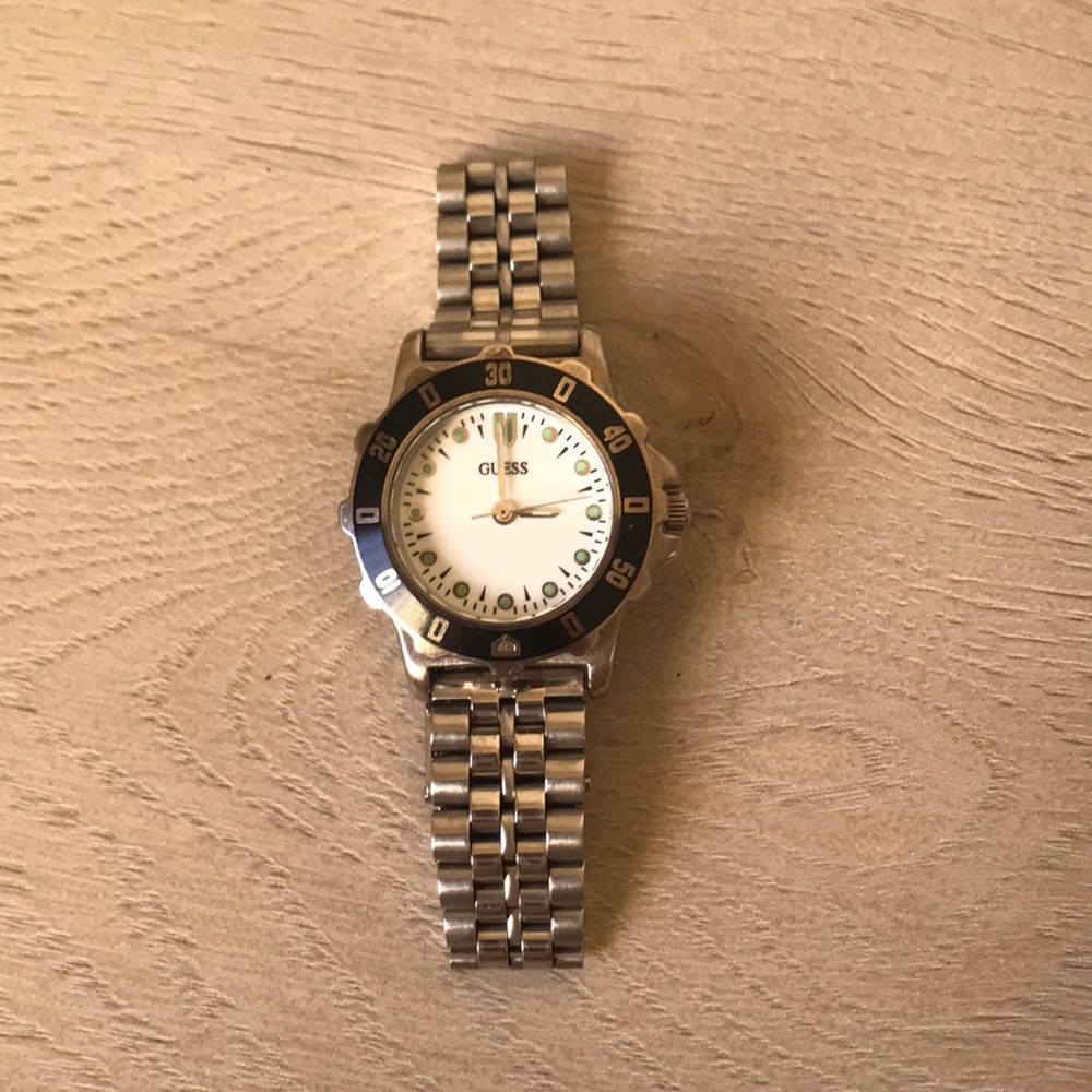 Pre-owned GUESS watch with Japan movement, luminous dots for the hour marks that glows in the dark. Has a uni-directional rotation bezel. In great condition. Needs a battery.