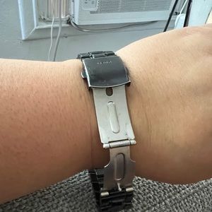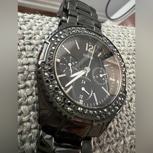 Good condition. Women’s waterpro multi function chronograph watch, steel. Double ring with zircons on the case. No box