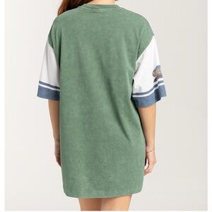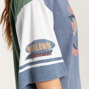 Guess Originals Western Dress. Featuring a classic t-shirt silhouette with short sleeves and a crew neckline, this dress is versatile and easy to style. Graphics screened on front and sleeves. Color block design. Vintage wash. Can fit XS-L oversized fit