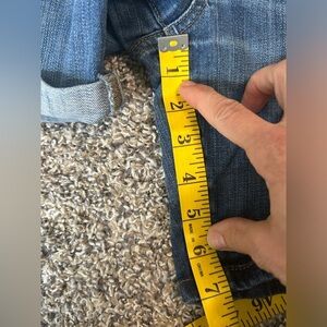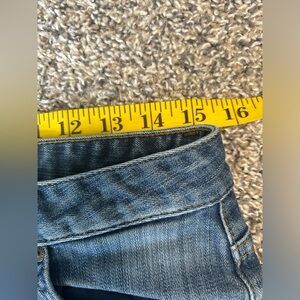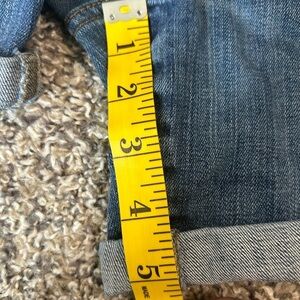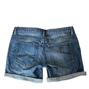 GUESS women’s mid-rise button-fly medium wash jean shorts.
