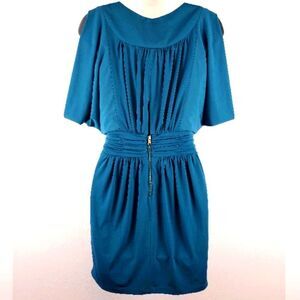 Teal mini dress with scoop neck and open sleeves. Has zipper on back and lined.
