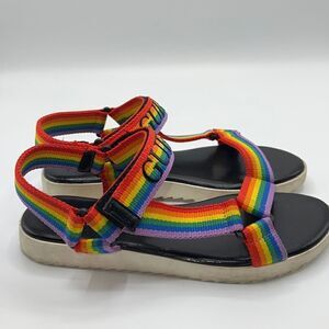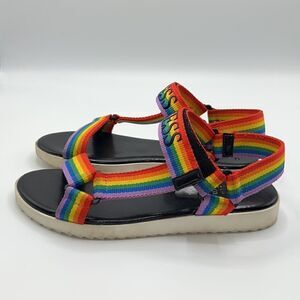 Nylon Strappy dad sandal worn velcro closure, white nonslip bottom. Manmade materials. Size 7M, excellent condition.