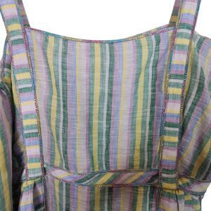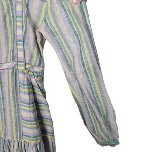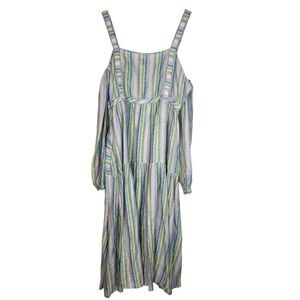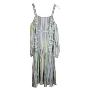 GUL HURGEL Dress Womens Large Green Pink Striped Linen Midi Dress Long Sleeve